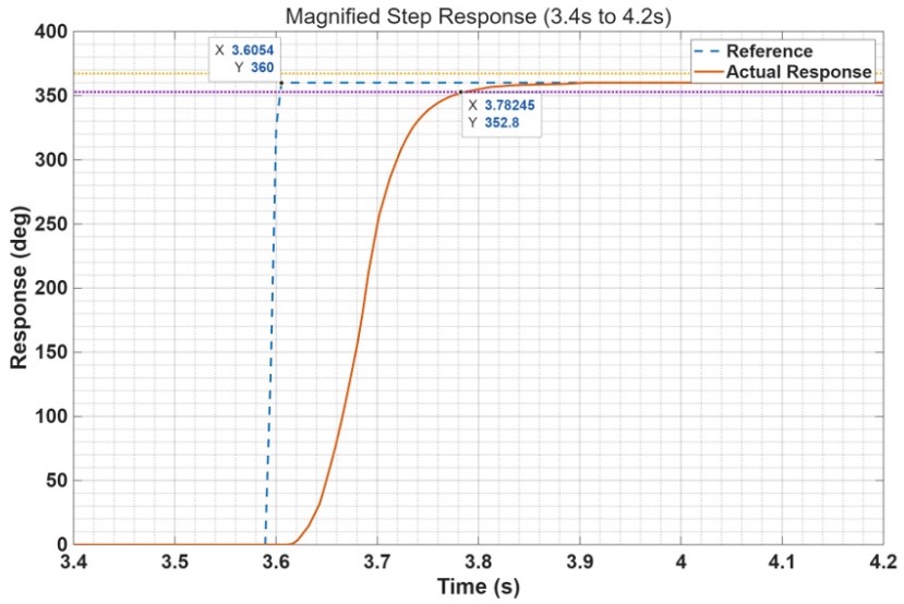 Step Response (0°→360°→0°): Settling time ≈ 0.18 s (±2%), steady-state error ≈ 0.029°.