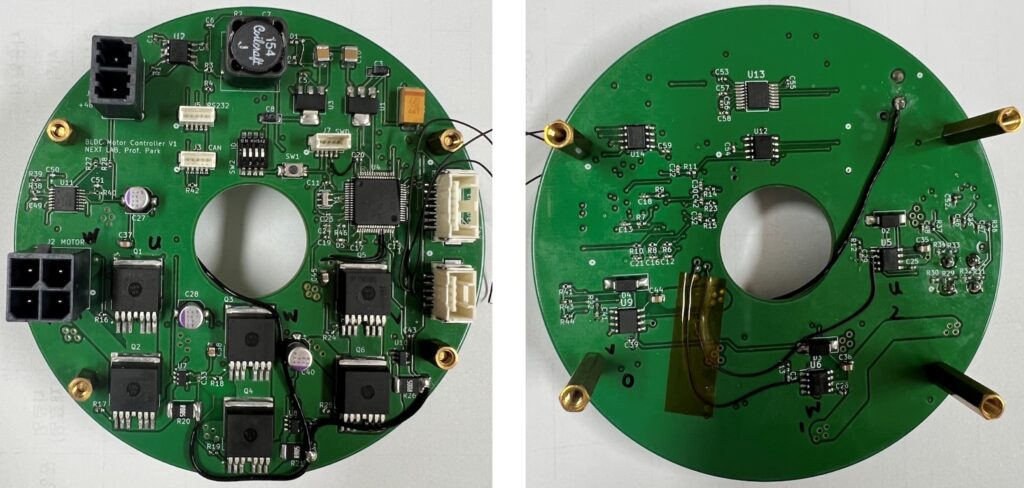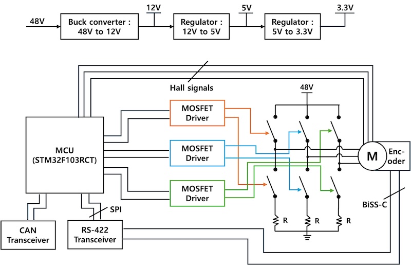Custom Controller: Cascaded buck supplies (48→12→5→3.3 V with LM5169), IRS2184 half-bridge gate drivers, low-side current sensing via INA180A1, BiSS-C over RS-422, and CAN to the host. PID position control at 1 kHz.